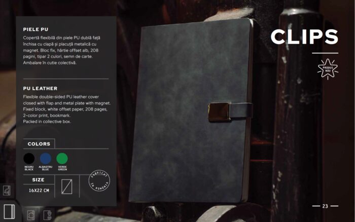 Agendă piele PU CLIPS Agendă CLIPS cu copertă flexibilă din piele PU, cu clapă și plăcuță metalică cu magnet. Bloc fix nedatat, format: 16×22 cm, hârtie: offset alb, nr. pagini: 208, tipar: 2 culori Culori coperți: negru, albastru, verde
