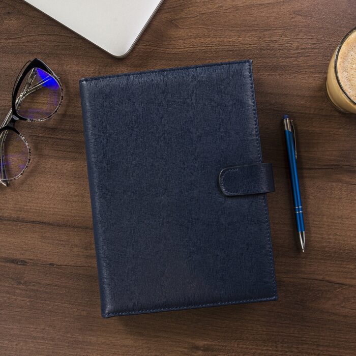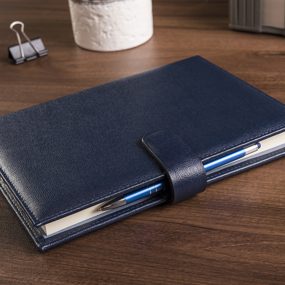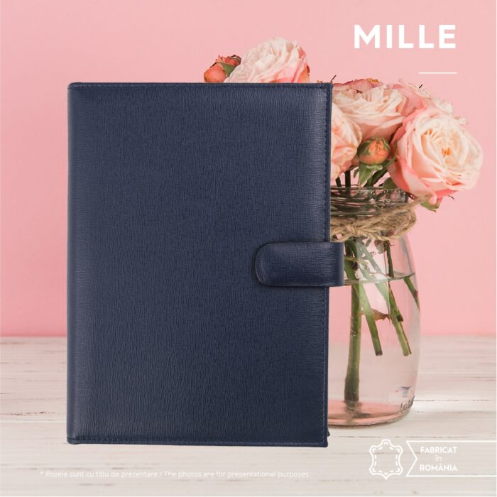 Agendă cu coperți flexibiledin piele naturală, buretate, cu sistem de închidere cu clapă din piele, suport pentru pix.
