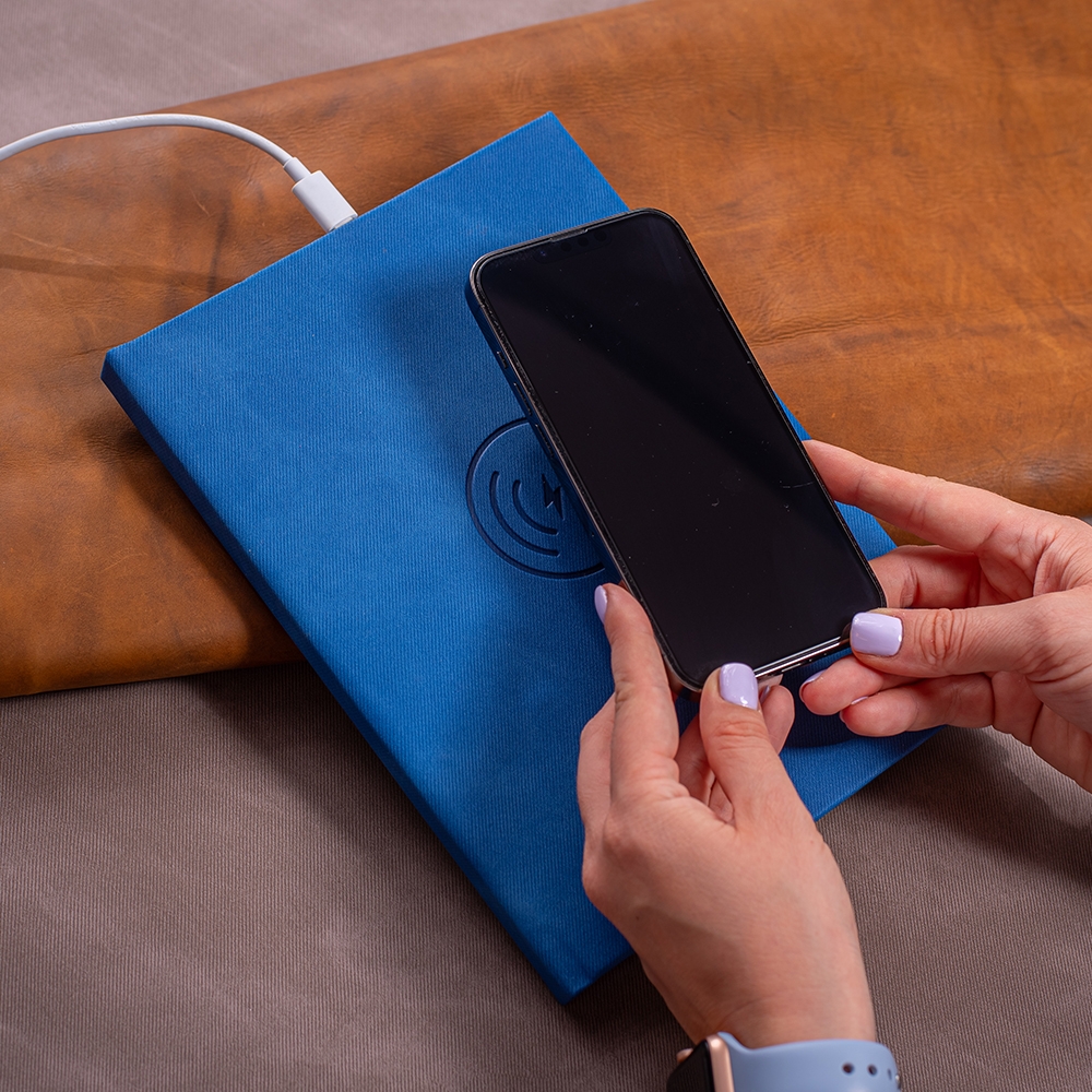 Agendă TECH cu coperă tare din piele PU, cu încărcător wireless 15W încorporat (compatibil si cu 10W, 7.5W, 5W) și cablu de conectare USB.
