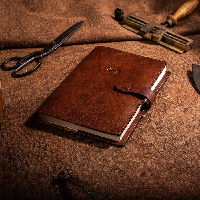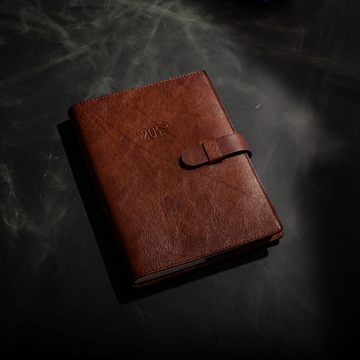 Copertă flexibilă din piele naturală, NON ALERGICĂ, finisată pe margine prin vopsire în 3 straturi și lac, cu buzunare diverse în interior. An embosat pe coperta 1.